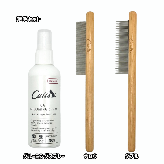 短毛の猫:ダブル → ナロウ の順に使用。抜け毛を取り除いたあと、ツヤ出しで仕上げます。